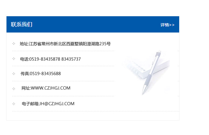 地址:常州市新北區友邦商務大廈1幢16、17層  電話:0519-85101652  傳真:0519-85112595  郵編:213022  網址:www_cz-jiayue_cn.1688mj.com  郵箱:xiajifengaa@163.com